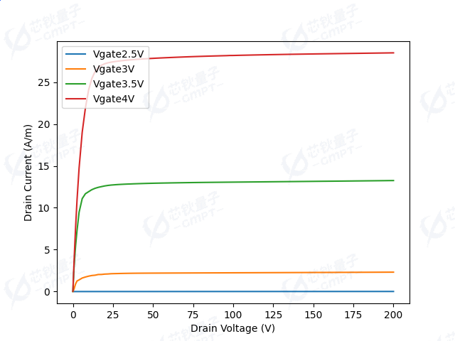 图5展示了超结VDMOS器件在栅压分别为2.5V,3V, 3.5V和4V下的转移特性。已知器件的阈值电压为2.8V,所以栅压为2.5V时器件沟道未打开,器件此时没有正向输出。当栅压大于阈值电压后,器件沟道打开并开始正向输出,随着栅压增大器件的输出也随之增强,漏电流也在漏极电压增大之后趋于饱和。
